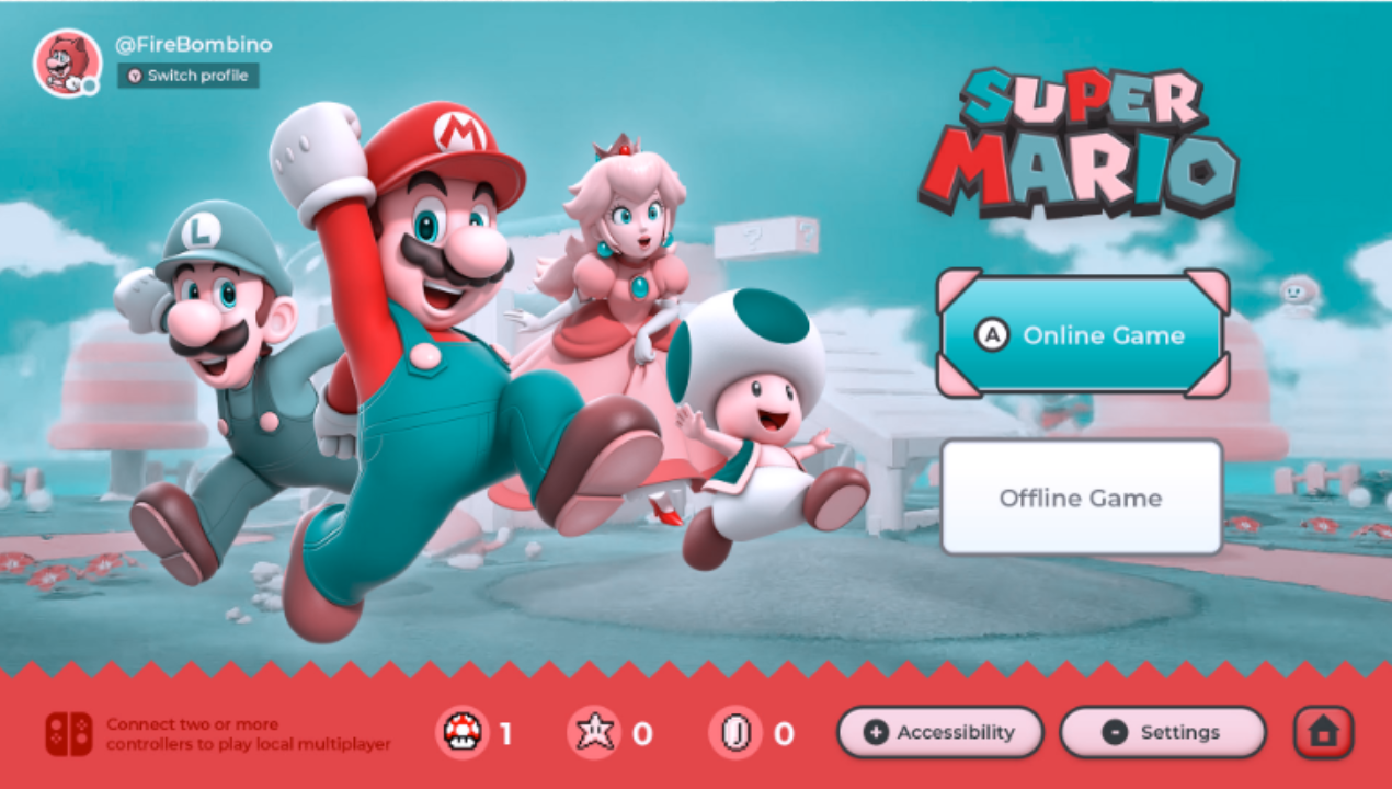 I designed a high fidelity UI mockup in the style of Super Mario for Nintendo Switch.